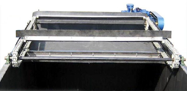 在分離區(qū)起端刮板放下,插入液面,向前進(jìn)行刮渣,將渣刮入排渣槽,到終端是刮板抬起,脫離液面,刮渣機(jī)返回,開(kāi)始下一個(gè)循環(huán)。