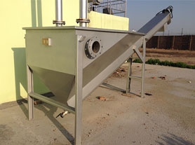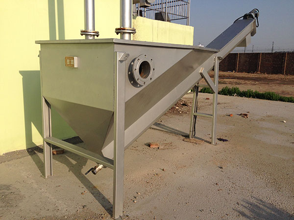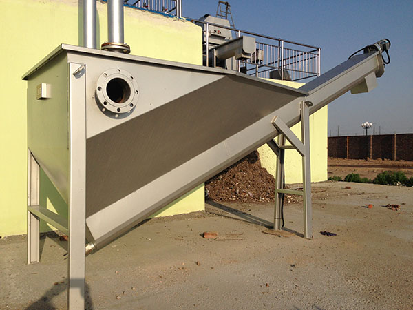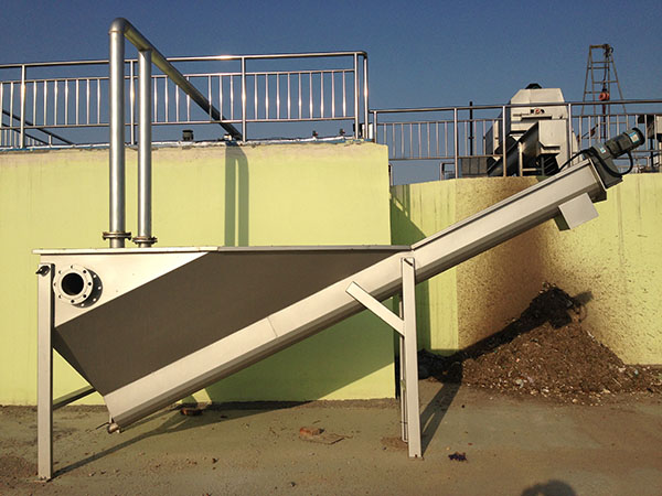 來(lái)自沉砂池的砂水混合物進(jìn)入砂水分離槽中,進(jìn)行砂水分離,水溢出池外,砂沉到槽底。轉(zhuǎn)動(dòng)的螺旋軸將砂沿25°螺旋槽輸送到頂部出料口,砂在輸送過(guò)程中進(jìn)一步分離,從而保證出料口的砂含水率不大于60%。